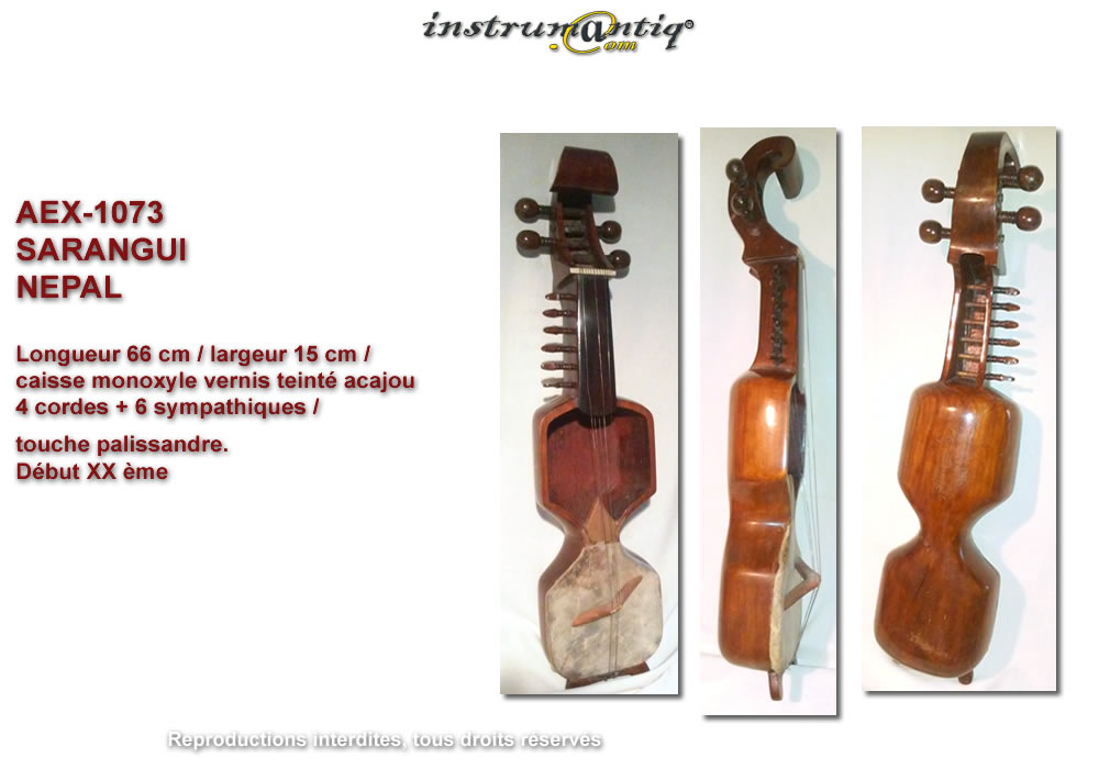 Longueur 66 cm / largeur 15 cm / caisse monoxyle vernis teinté acajou / 4 cordes + 6 sympathiques / touche palissandre. |